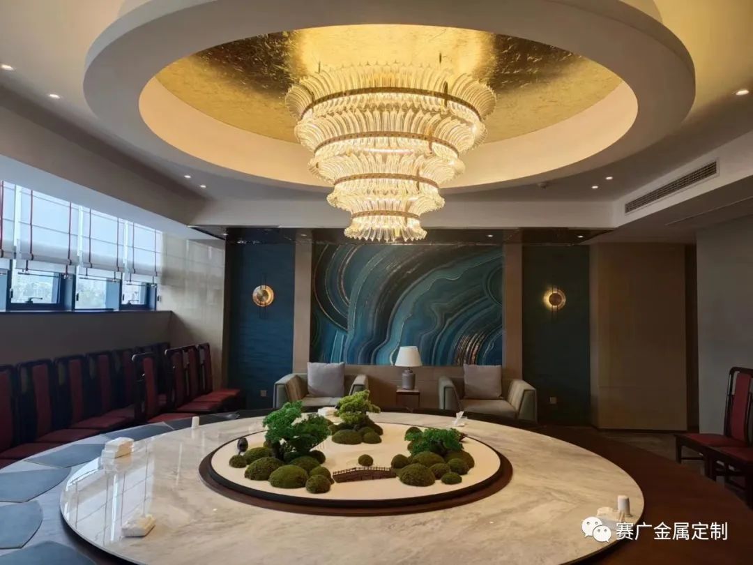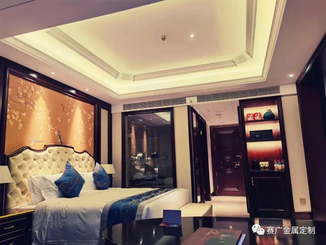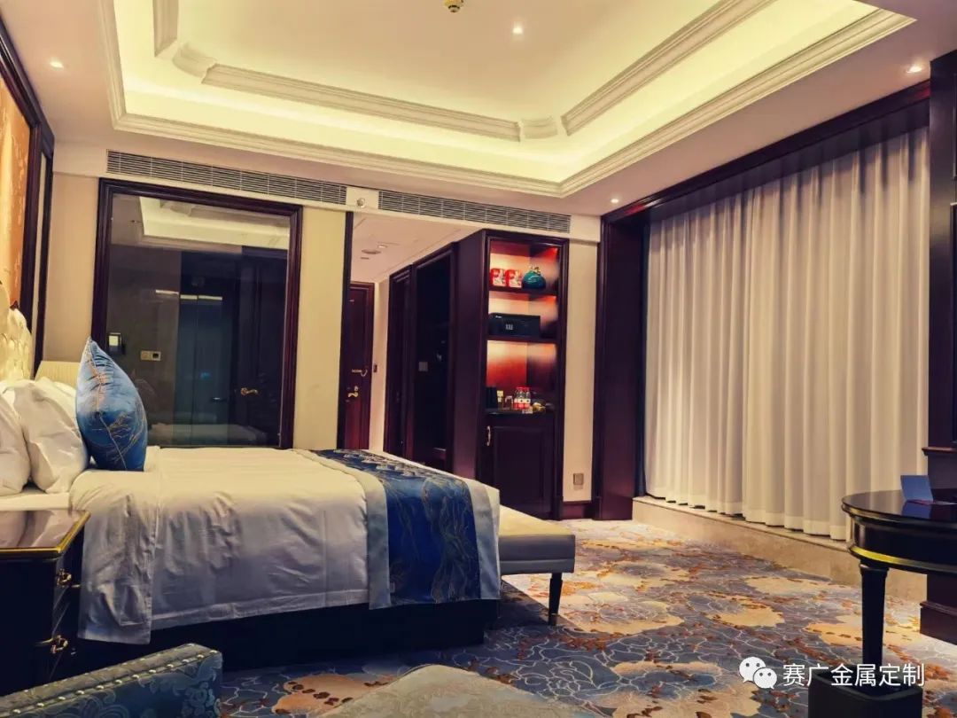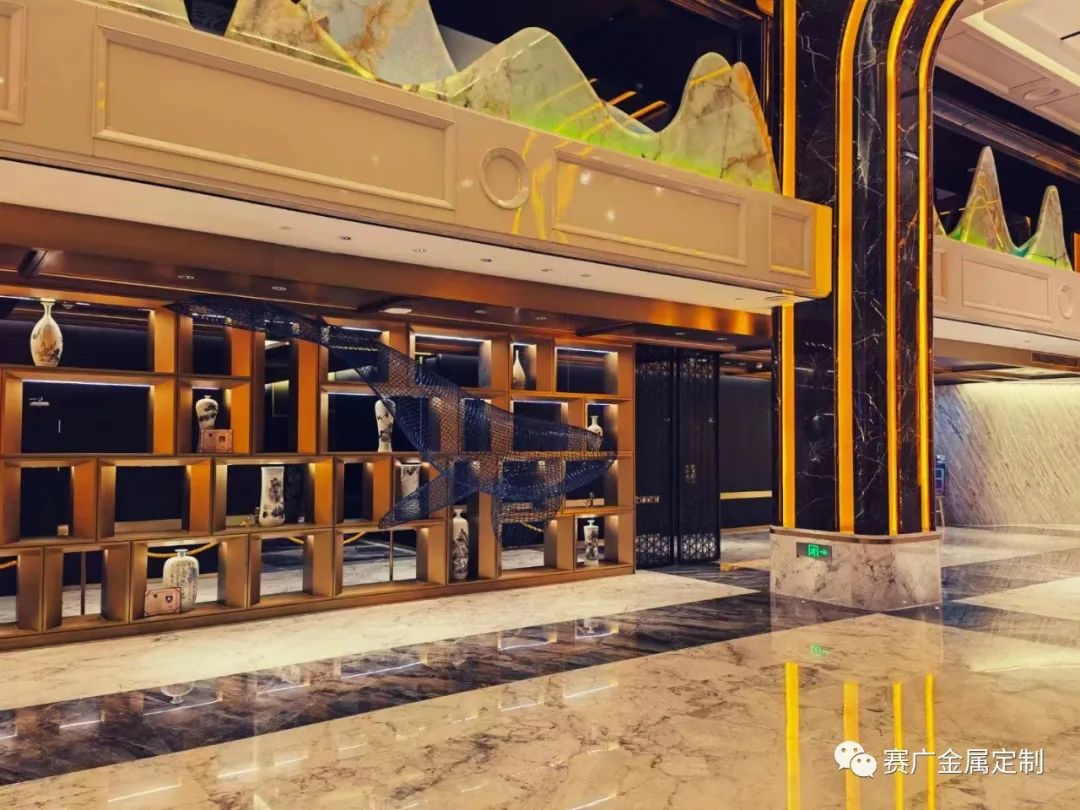 昭通海能酒店是雲南賽廣金屬2022下(xià)半年參與裝飾建設(shè)的一(yī)個酒店類項目,該酒店從承建規模到裝修檔(dàng)次在當地都頗有知名度。酒店裝修整體(tǐ)以中式輕奢風格為主,大量采用香檳金色、玫(méi)瑰金色的金屬勾勒線條,使華麗的效果更為突現。