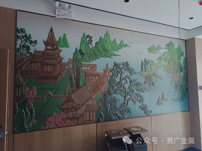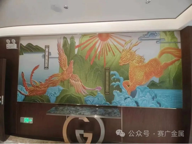 “金雞飛亮山,龍馬跳進江”,將江城的民間傳說用鋁(lǚ)板浮雕的方式(shì)呈現,栩栩如生,富有靈氣,其紋路清晰可見,造型極具藝術(shù)美感。