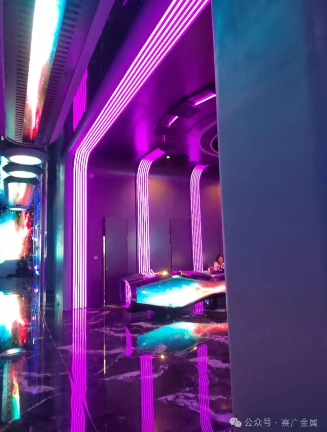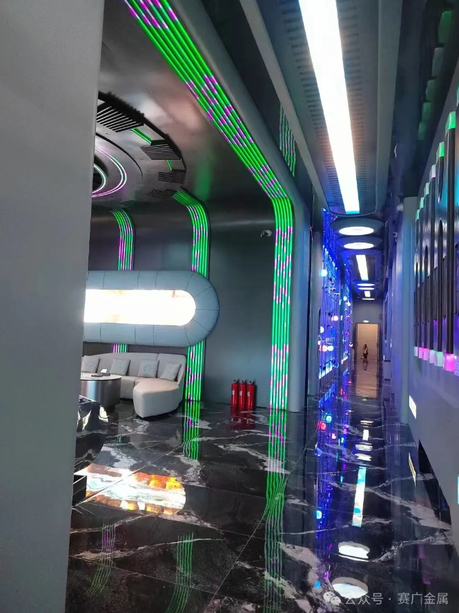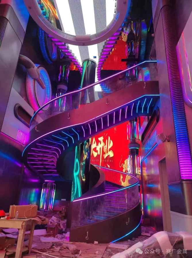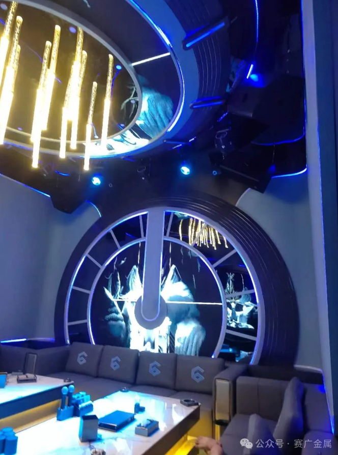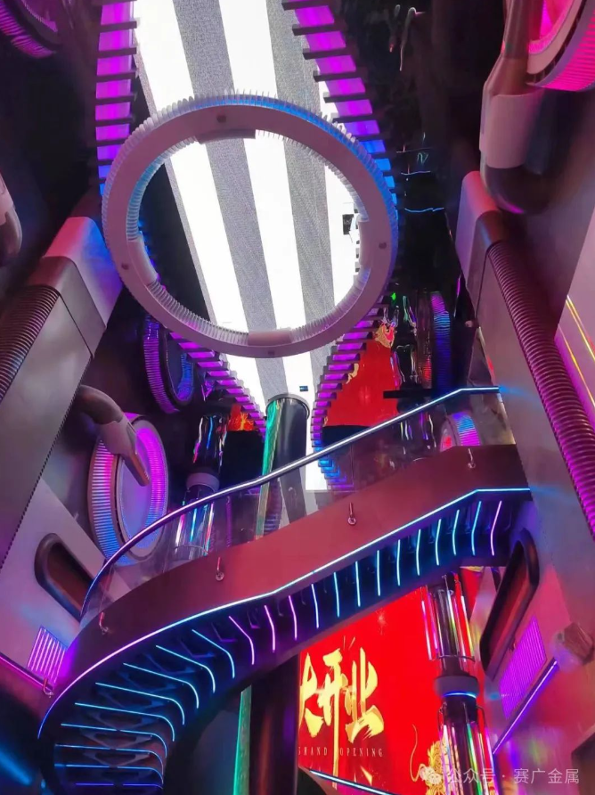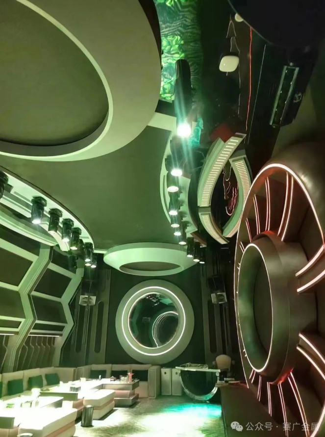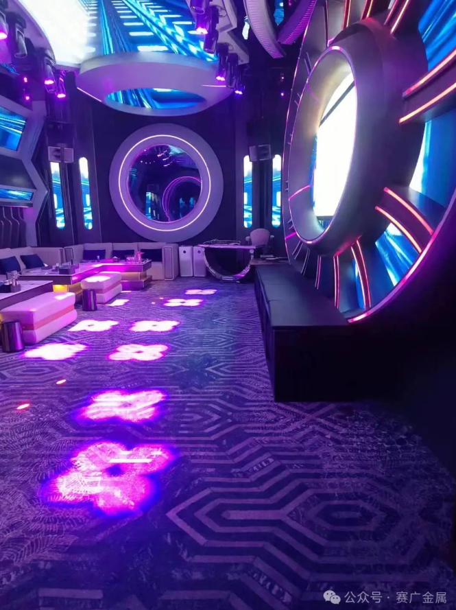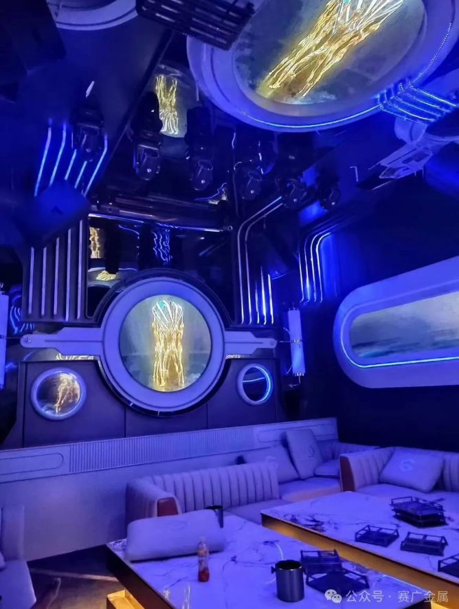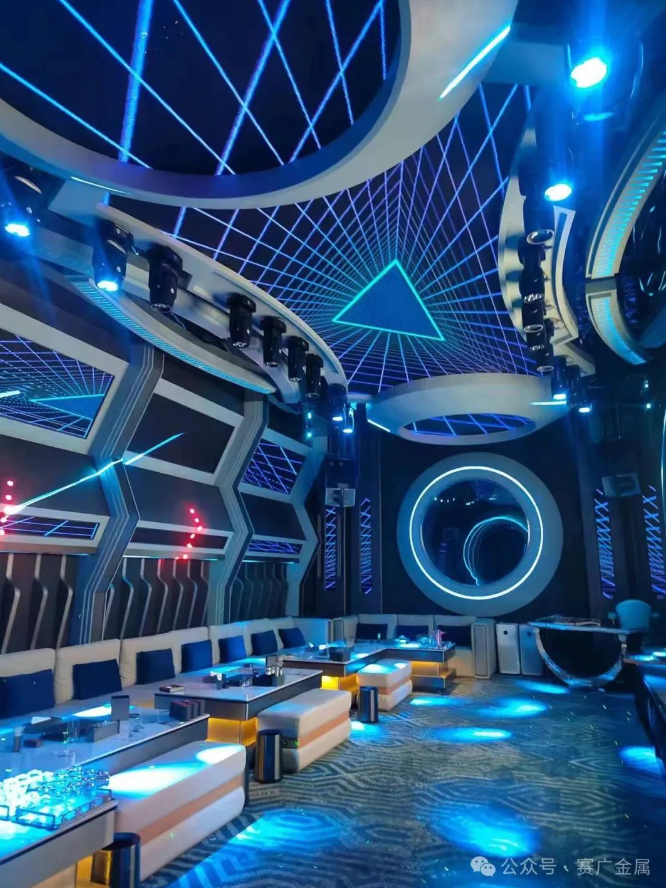 六號公館作為當地地標性的娛樂場所, 其設計和裝修上(shàng),必然要有一個獨具風格特色的表達效果(guǒ),大量異形金屬的加入,能很好地形成視覺亮(liàng)點,讓空間更具科技感。