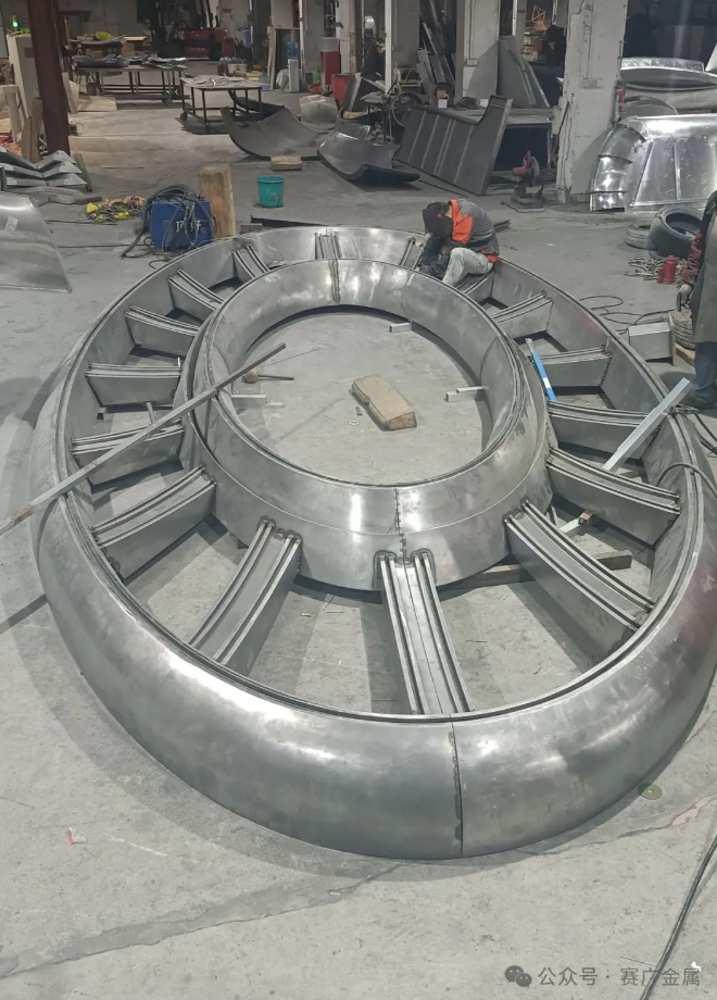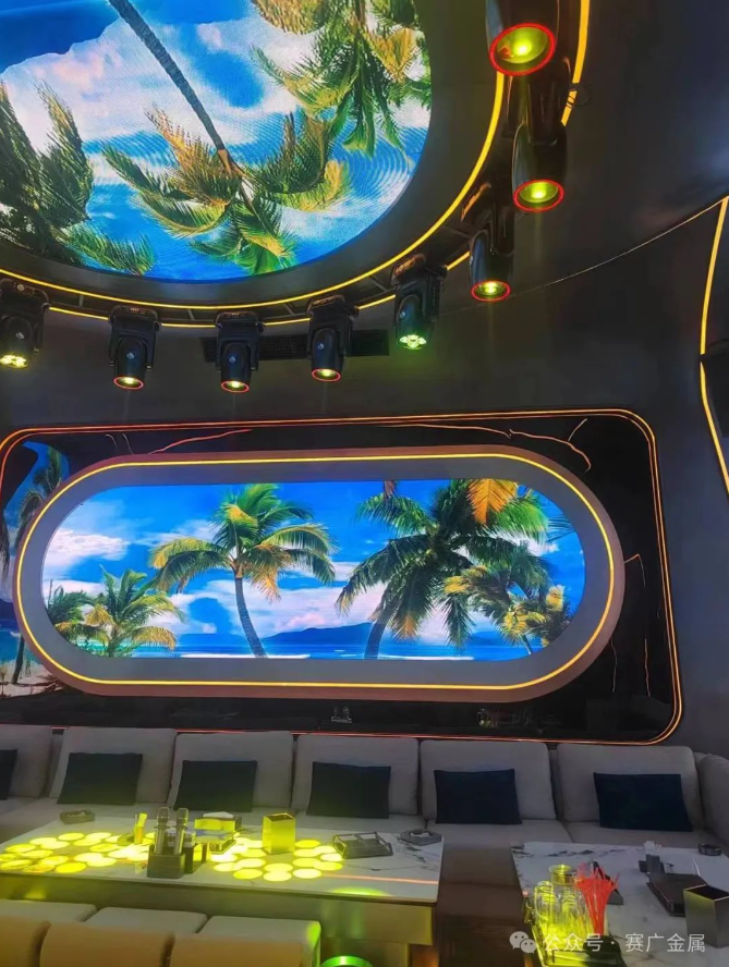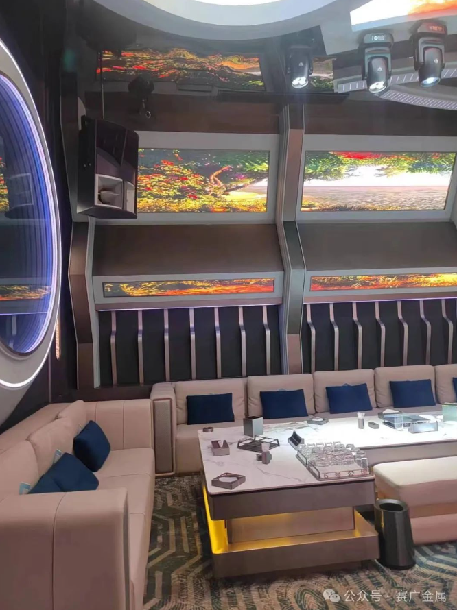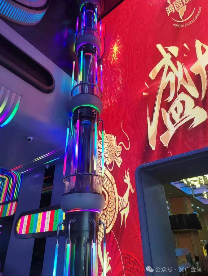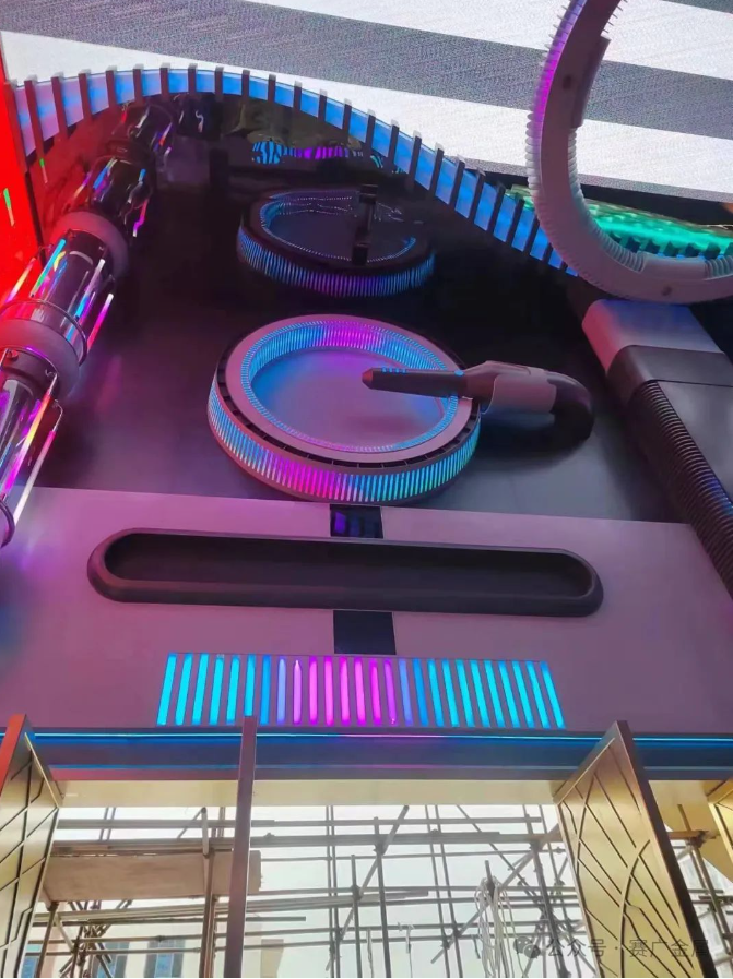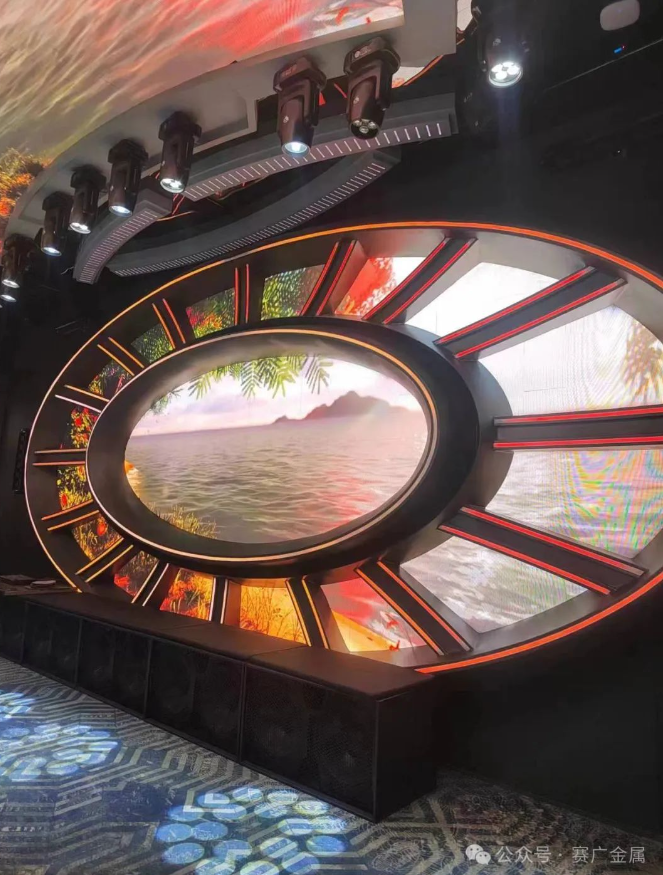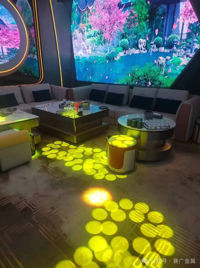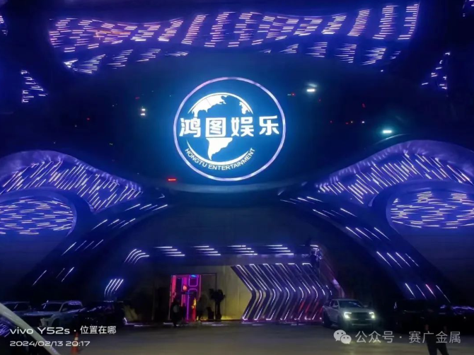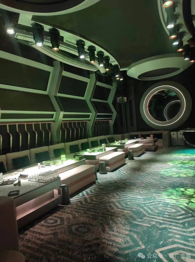 六號公館作為當地地標性的娛樂場所, 其設計和裝修上(shàng),必然要有一個獨具風格特色的表達效果(guǒ),大量異形金屬的加入,能很好地形成視覺亮(liàng)點,讓空間更具科技感。