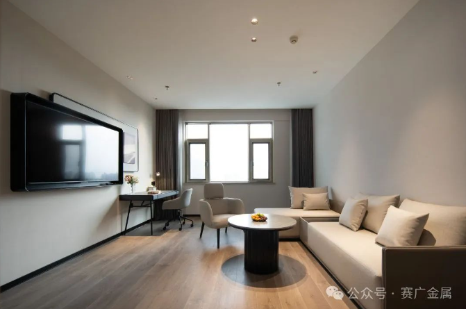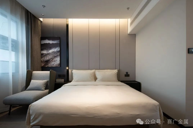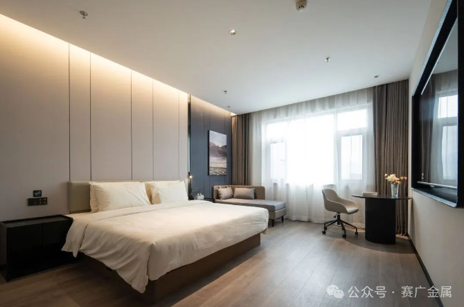 酒店內部古銅及黑鈦色調(diào)金屬包板顯得(dé)格外吸睛,錯落(luò)有致的排列貫穿全廳,古樸典雅,賦予空間溫暖與高貴的氛圍。