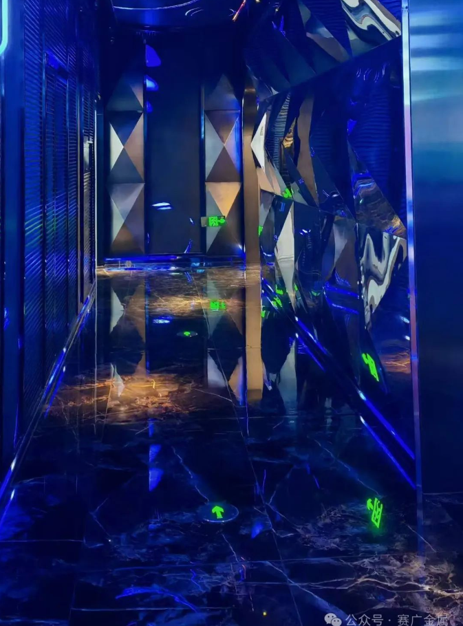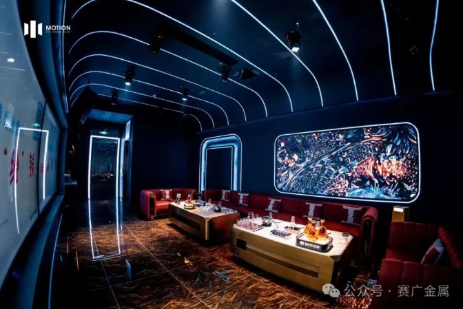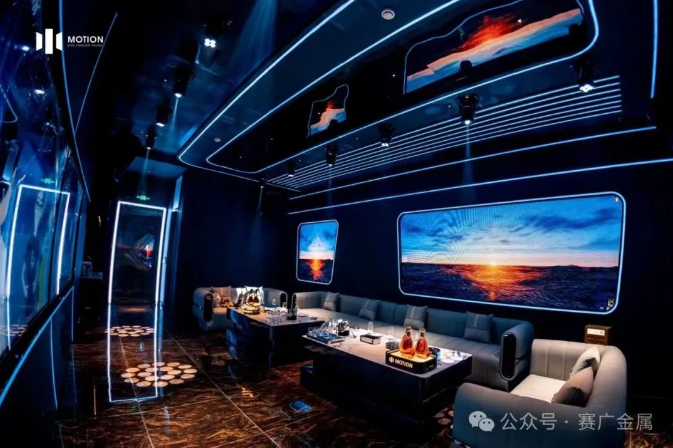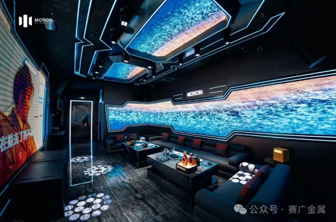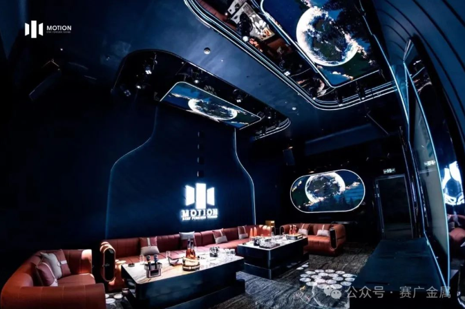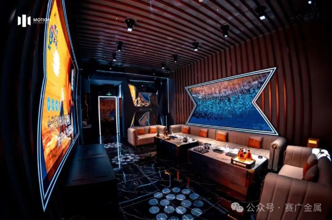 KTV金屬造型運用於牆麵和(hé)天花部分,起到裝飾(shì)和美化環境的(de)作(zuò)用,突(tū)出了KTV的主題和風格,頗有現代時尚風範。