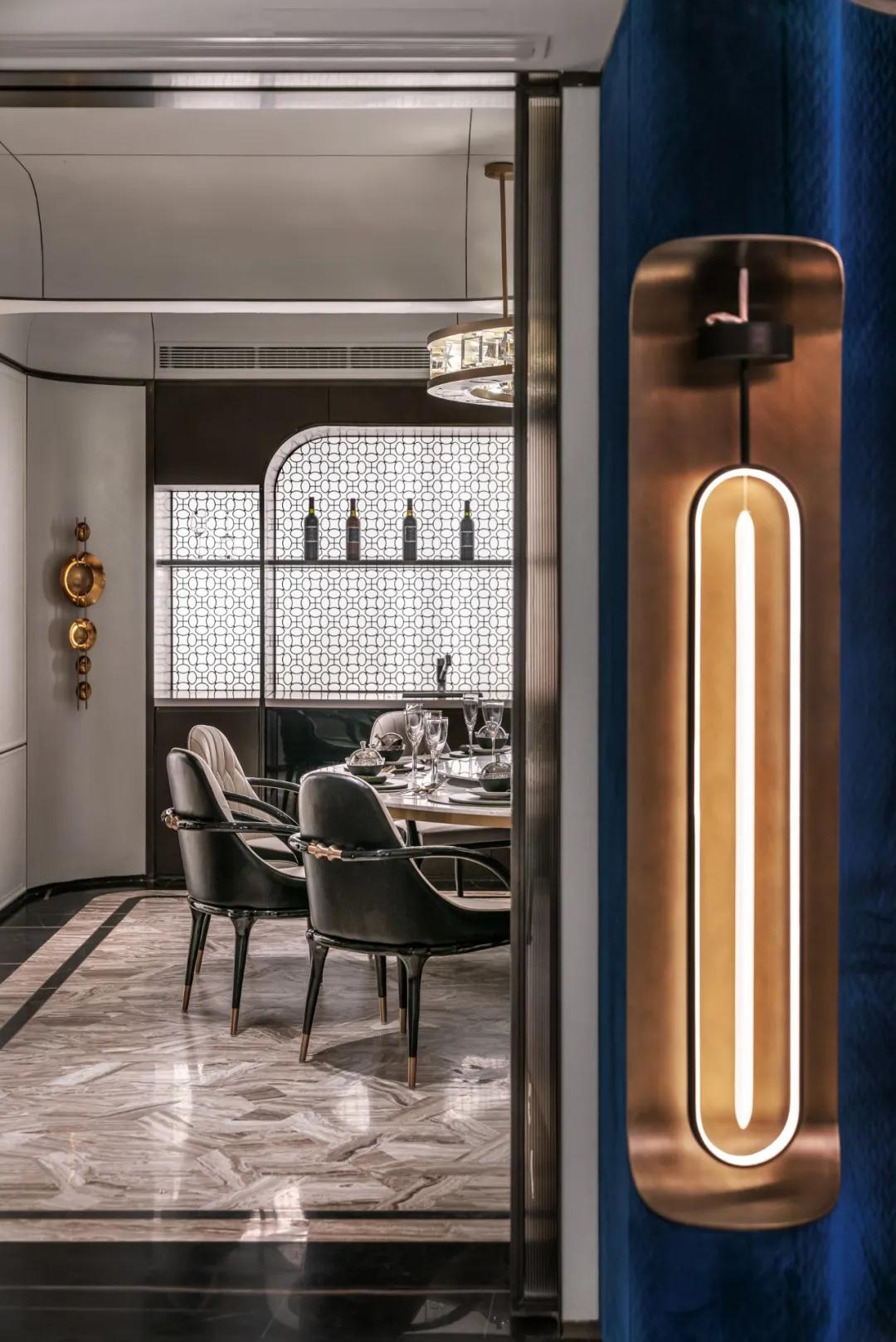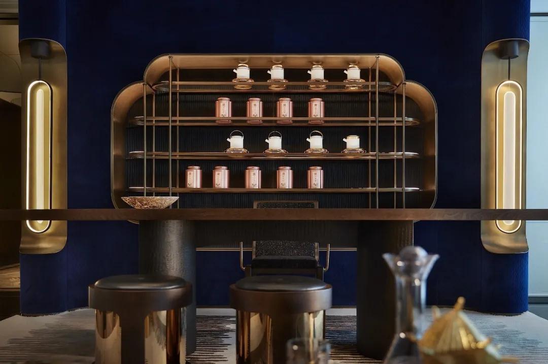 同樣,茶室蘊含著中外古今的精粹,擁(yōng)有超然物外的自然舒適,延續設計手法和對稱美學,在色彩和特殊紋理上表現構造意向空間,藍色色調、金屬細節、材質變化的具象詮釋,直觀地表達新時代下,東方美學意境和現代都市的物化藝術之間的(de)融合。