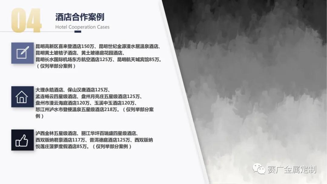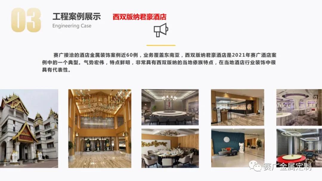 如今,賽廣產(chǎn)品銷往全國各地以及東南亞(yà)國(guó)家。合作過(guò)“海底(dǐ)撈,喜來(lái)登酒店,俊發(fā)地產,中鐵置業,緬(miǎn)甸(diàn)九號公館”等上百餘家企業(yè)。用無(wú)數的案例驗(yàn)證了實力,讓賽廣成為中國金屬定製行業(yè)的佼佼者。