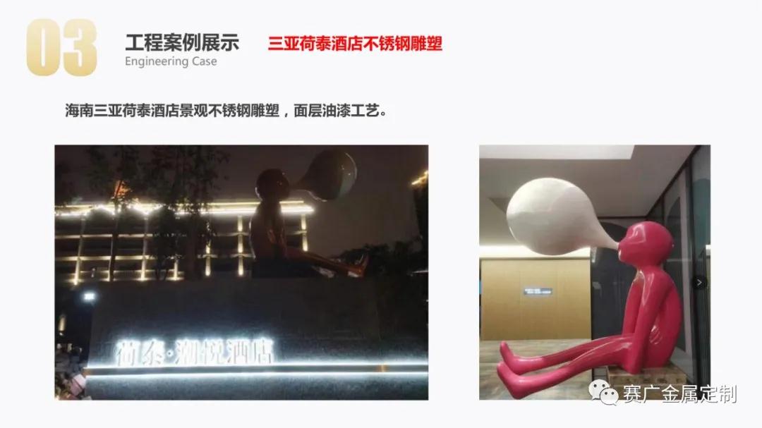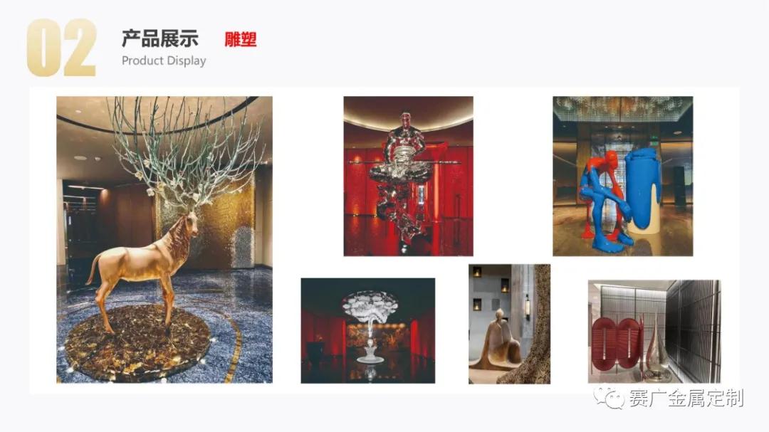 從2004年至今,賽廣專注於金屬產品的自主創新,研發設(shè)計與加工安裝(zhuāng),為(wéi)國際國內星級酒店,高端會所,高端(duān)樓盤,高端別墅的整(zhěng)體(tǐ)金屬產品提供專業服務,為景觀藝術,陳(chén)設類金屬雕塑,金屬(shǔ)高端產品提(tí)供個性化定(dìng)製服務,逐漸成長為集研發,設計,生產,銷售,加工,製作與(yǔ)安裝為一體(tǐ)的不鏽鋼金屬引領和(hé)示範性(xìng)企業(yè)。