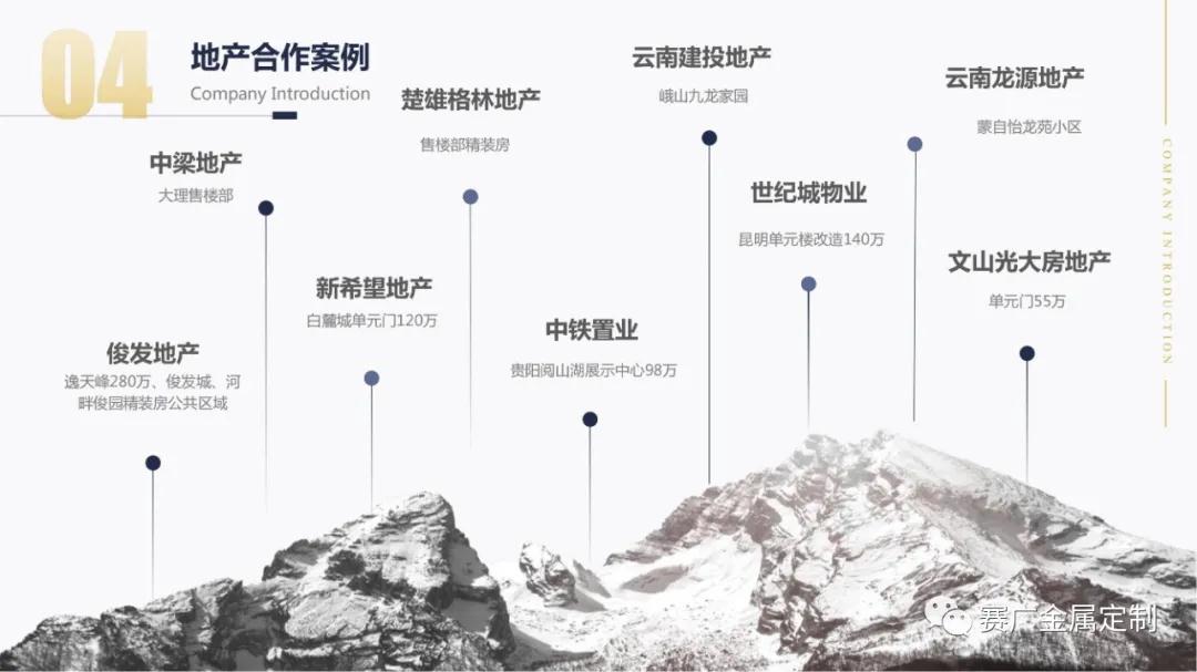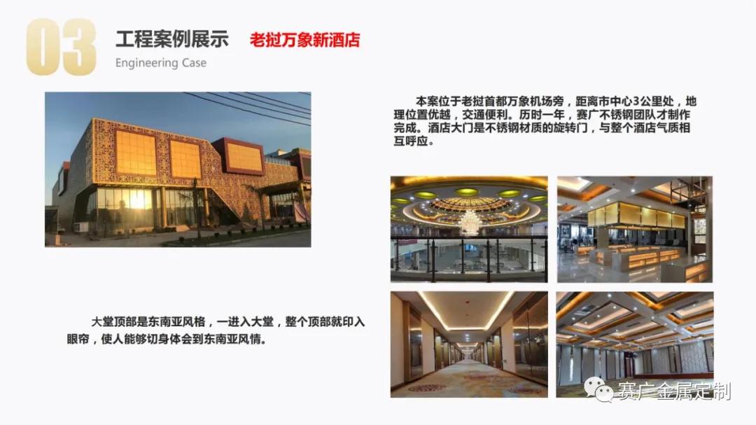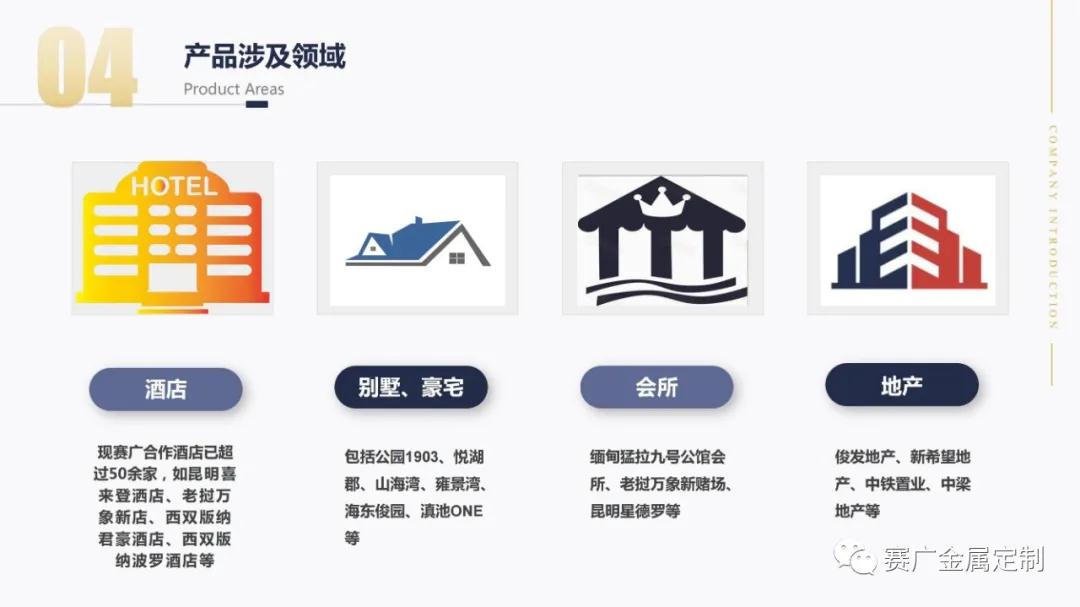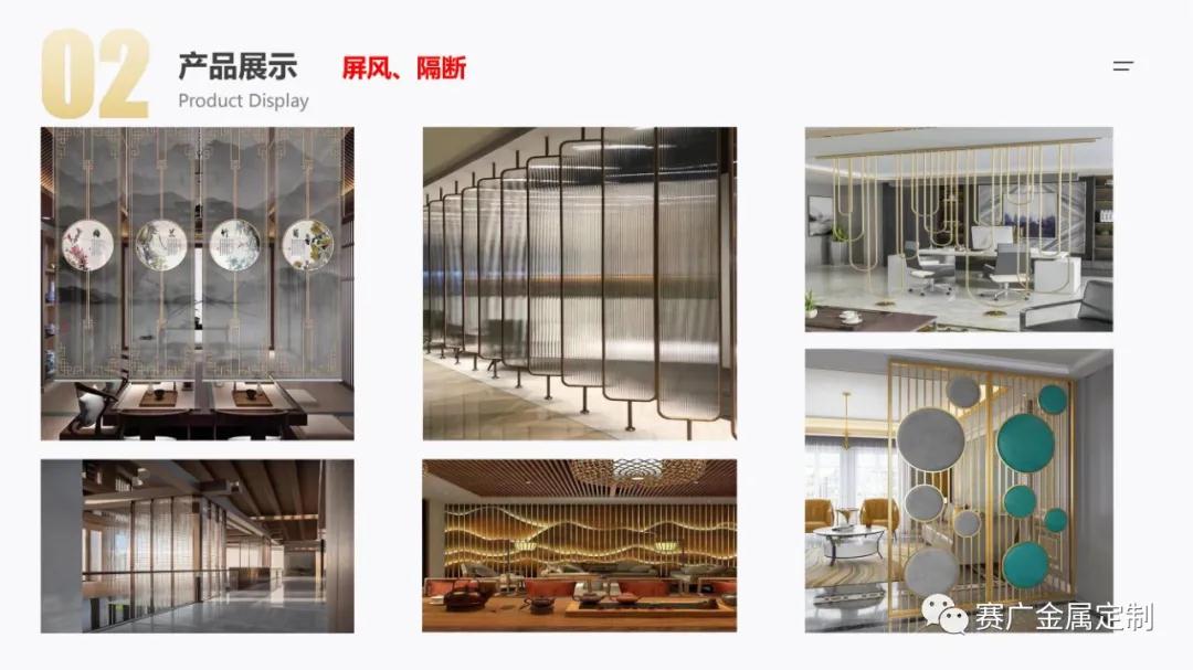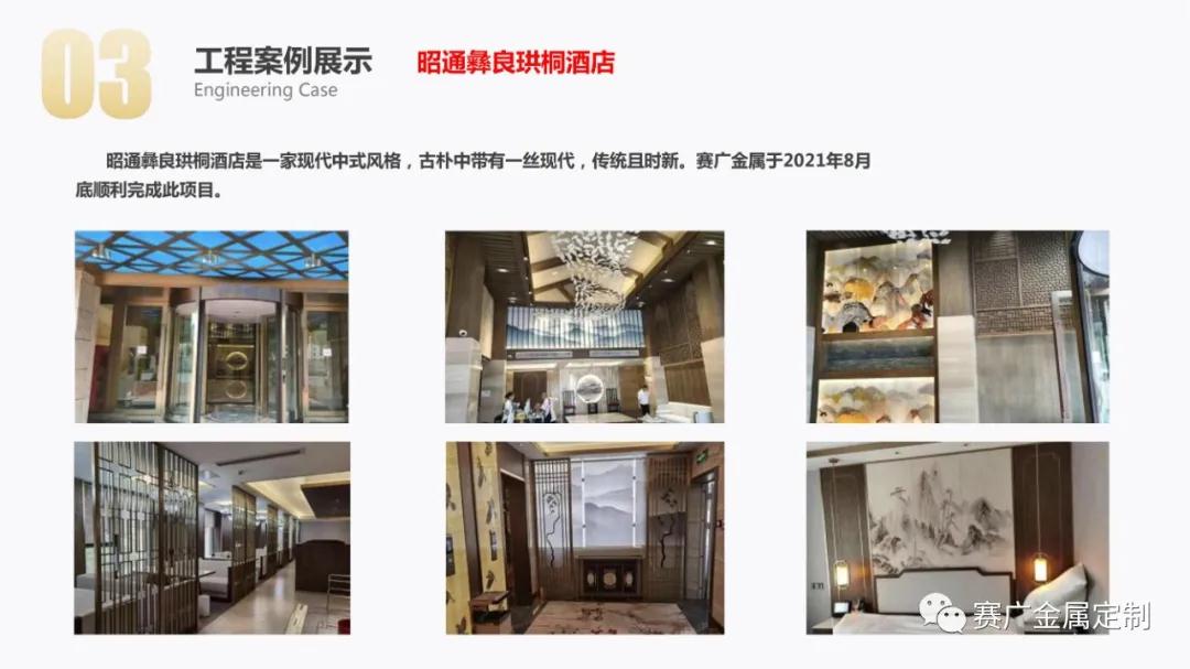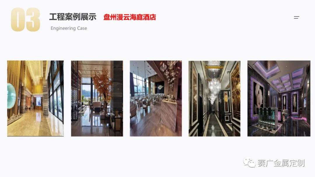 如今,賽廣產(chǎn)品(pǐn)銷往全國各地以及東南亞國家。合作過(guò)“海底撈,喜來登酒店,俊發地產(chǎn),中鐵置業,緬甸九號公館”等上百餘家企業。用無數的案(àn)例驗證了實力,讓賽廣成為中(zhōng)國金屬(shǔ)定製行業的佼佼者。