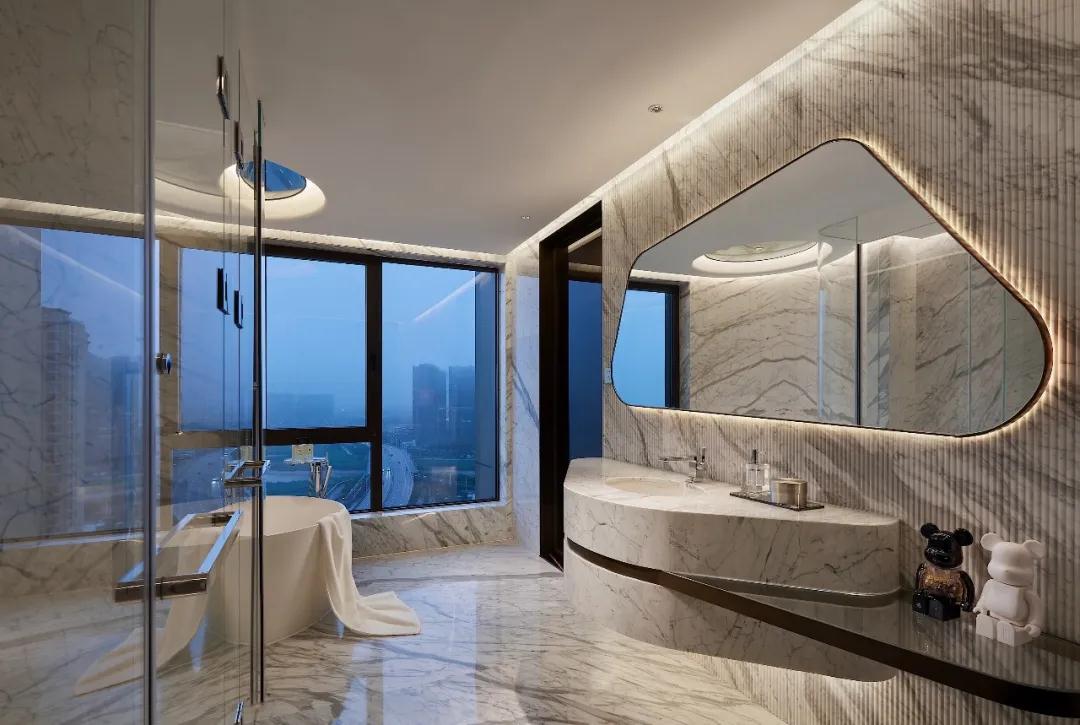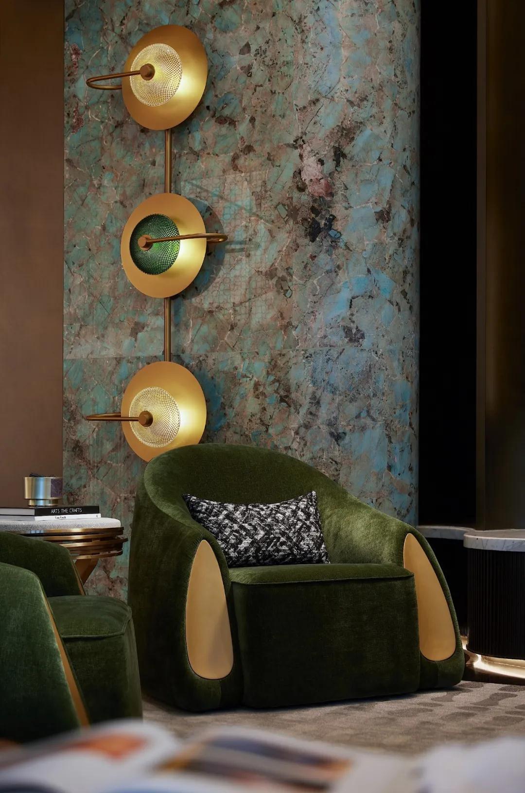 昂貴的亞馬遜綠(lǜ)奢石和複雜的工藝,遵循西方建築設計藝術理念,與金屬、水晶做呼應,兼具功能(néng)主義和美(měi)觀性(xìng);同時以曲麵處理,延伸自然色(sè)彩、元素、紋理,將東方意境中的空靈、輕柔呈現,從宏(hóng)觀角度感受無與倫比的建築創意和奢(shē)華感(gǎn),以細節(jiē)表達微觀思維的藝術性(xìng)、舒適性。