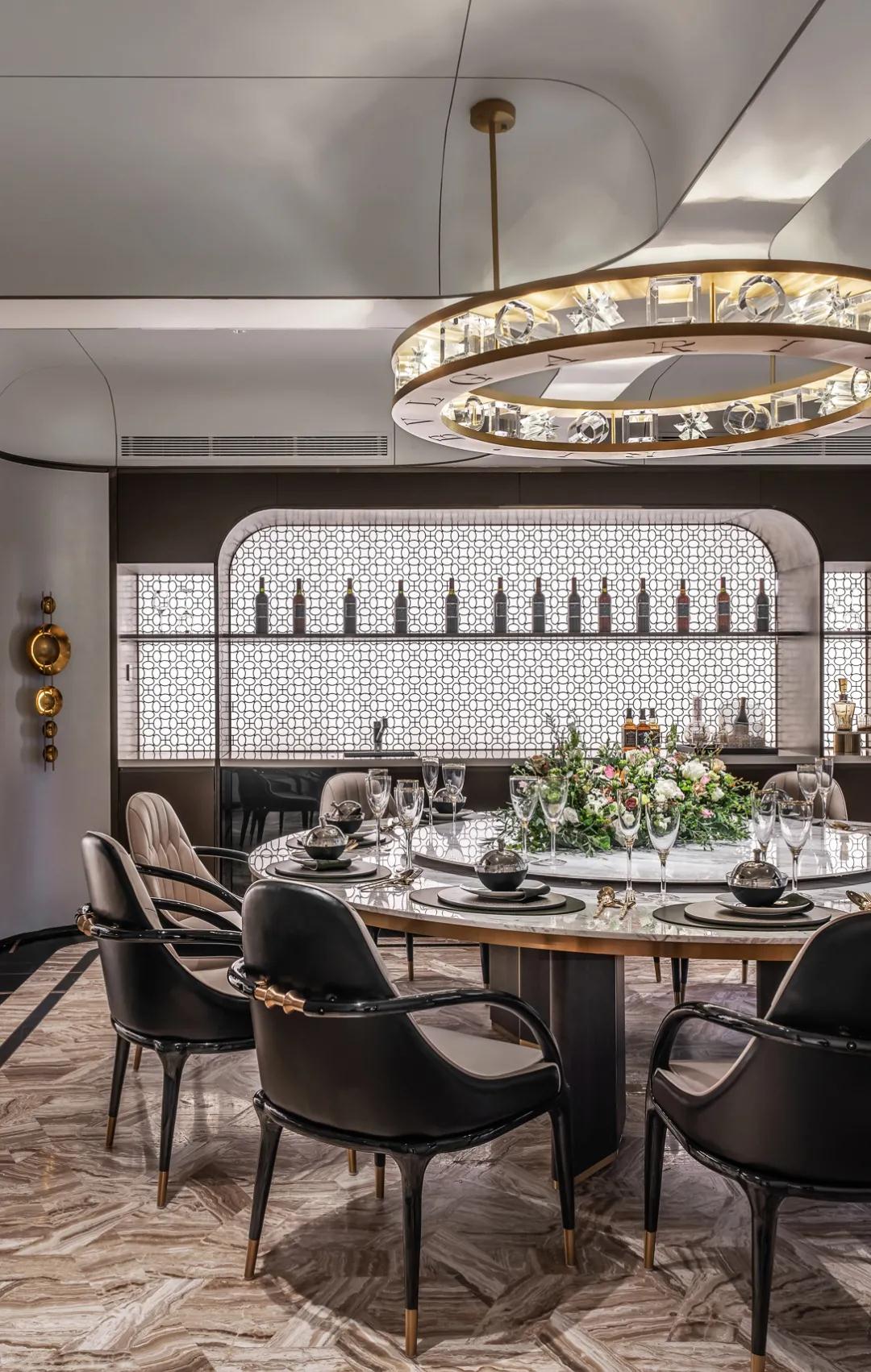 玄(xuán)關,猶如機械般的將空間切割為二,巨型施華洛世奇水晶藝術裝置貫穿一、二層,仿佛巨木拔地而起,流光順“樹根”向上生長,華麗與(yǔ)自然並存,賦予空間強大的生命力,璀璨不息。客餐廳被分立兩邊,設計風格的多元性,矛盾性沒有被刻意隱藏(cáng),相(xiàng)反,強烈對比之下空間以兩種姿態和諧共(gòng)生。