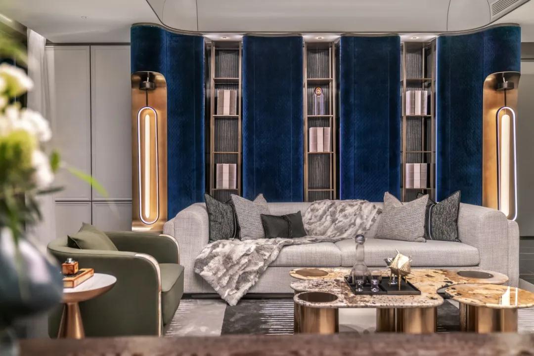 同(tóng)樣,茶室蘊含著中外古今的精粹,擁有超然物外的自然舒適,延續設計手法和對稱美學,在色彩和特殊紋理上(shàng)表現構造意向空間,藍色色調、金(jīn)屬細節、材質變化的具象(xiàng)詮(quán)釋,直觀地(dì)表達新時代下,東方(fāng)美學意(yì)境和現代都市的物化藝術之間的(de)融合。