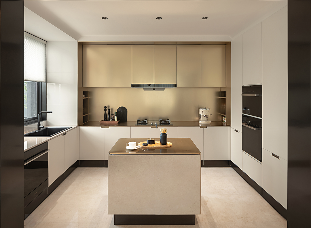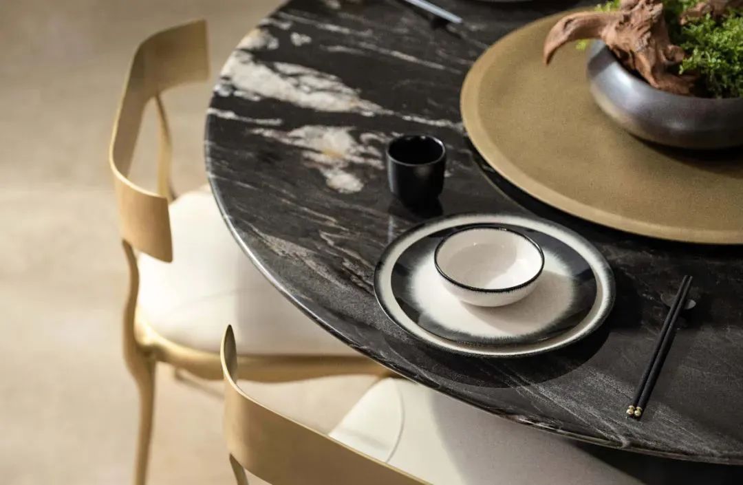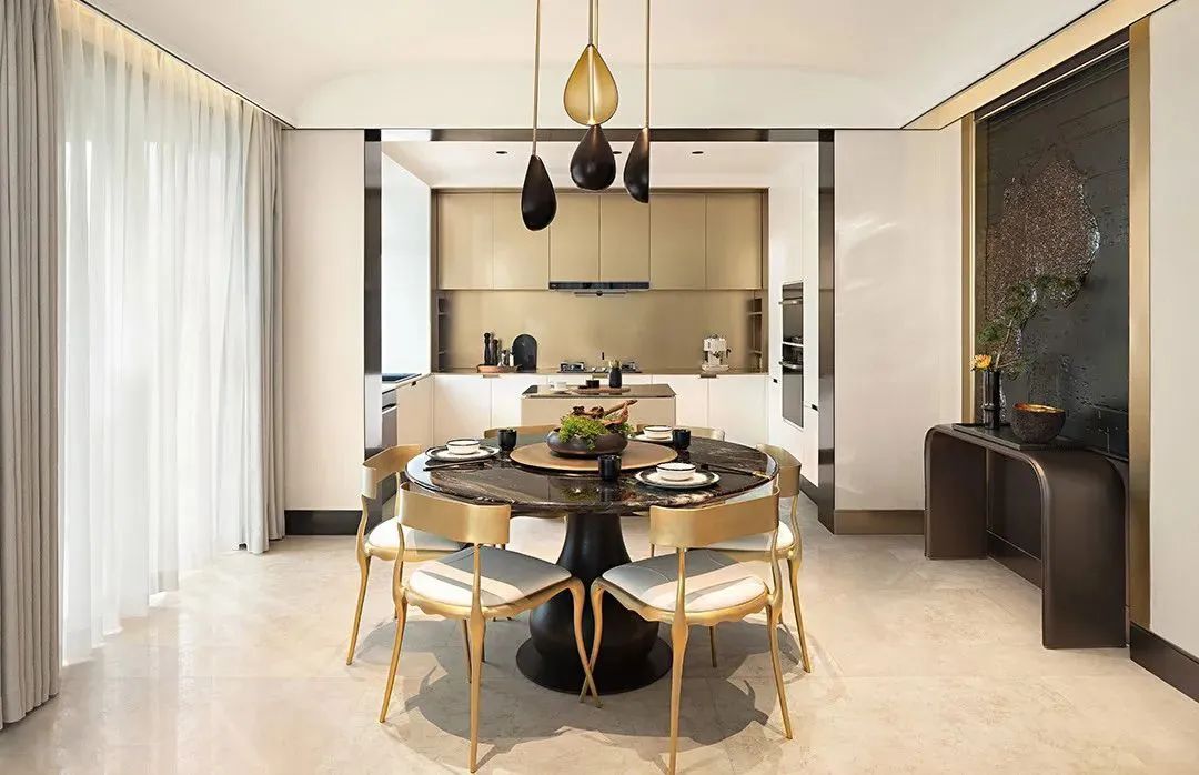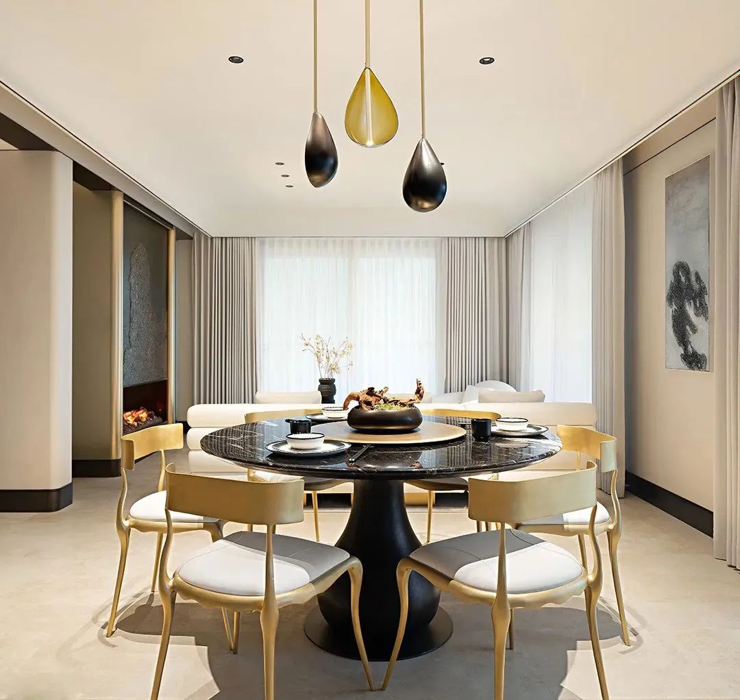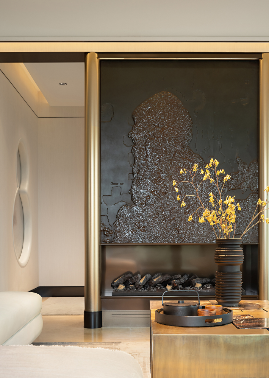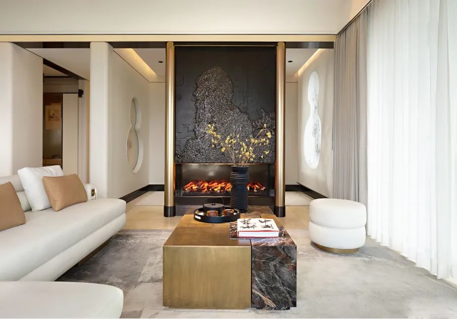 金色的金(jīn)屬造型(xíng),圓柱造型精(jīng)致而圓潤,黑色及金色(sè)的對比,高級顏(yán)色的搭配,結合壁爐的設計,高級感十足。客(kè)廳圍合沙發組合,圍繞著壁爐(lú)而(ér)坐,營造(zào)客廳社交場景畫麵。