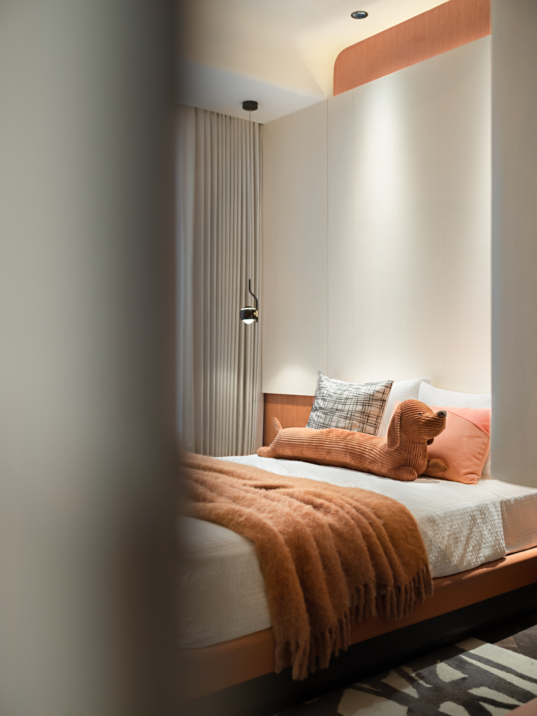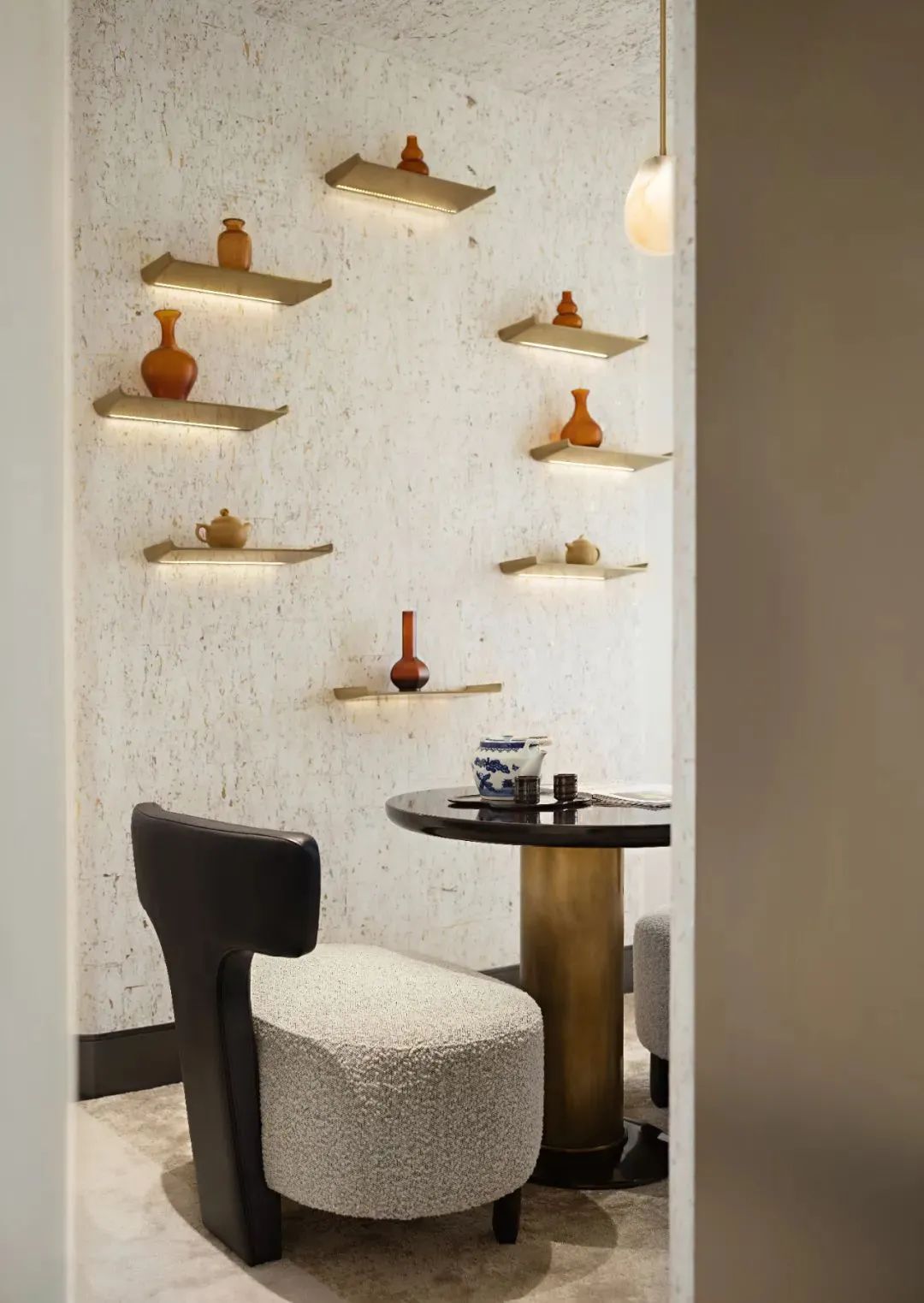 白色牆(qiáng)麵處理,黑色腳線(xiàn),留白設計手法(fǎ),精致的層架為牆麵增添了一絲與眾不同,紅色花瓶為空間營造了整體的(de)意(yì)境,品茗暢聊(liáo),流尚於清閑(xián)時(shí)光,一抹寫意,幾許禪意(yì)。