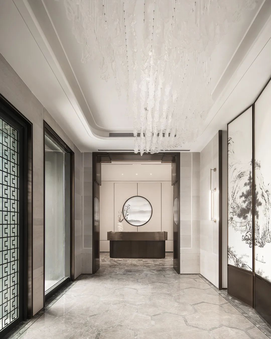 山(shān)水潑(pō)墨,錦繡繁花,借自然屬性點睛,讓室內及(jí)自然(rán)形成安靜的互映關係,從而讓光更立體化,月白色、紋路灰、經典(diǎn)咖交相輝映(yìng),空間層次感盡顯,人的視覺及尺度更舒適。