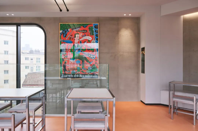 從四樓的入口踏入咖(kā)啡館,人們就會看到這個空間的標誌,銀色的柱子和(hé)橙色的地板。由於這棟樓沒有電梯,顧(gù)客不得不費盡周折走上幾(jǐ)層樓。