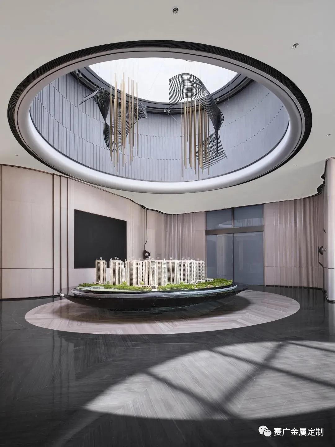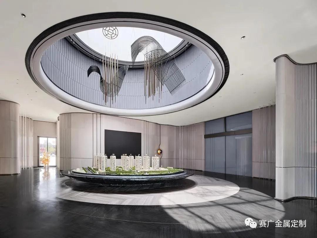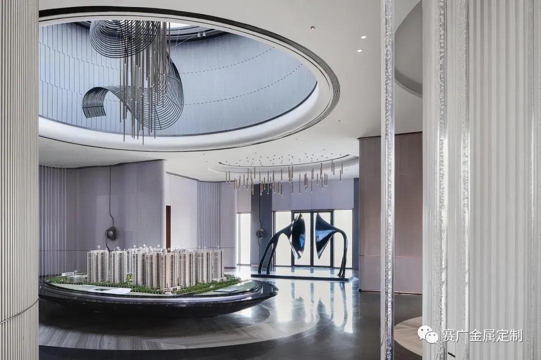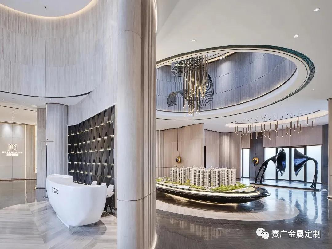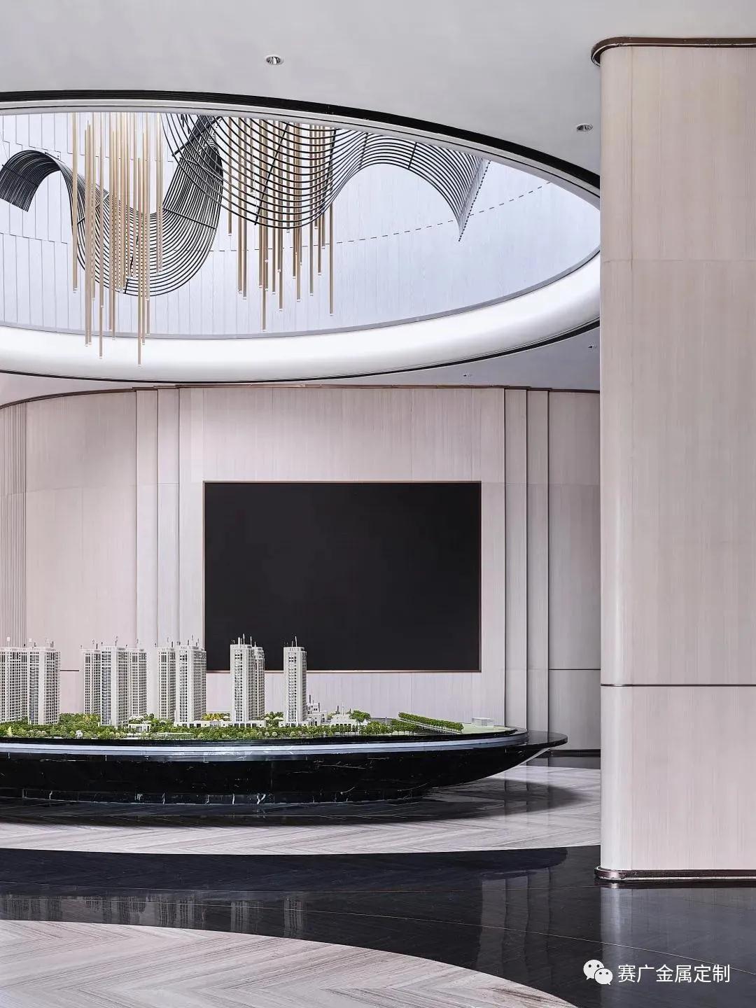 錯落有致的金屬板背景牆賦予(yǔ)空間張力,船型接待台(tái)置於一側,仿佛能看到這座城市中經年累積的海港(gǎng)文明在此上演,將身臨其境的人塑造為時(shí)間的體驗者,以設計語匯勾(gōu)勒即將綻放的美(měi)好生活。